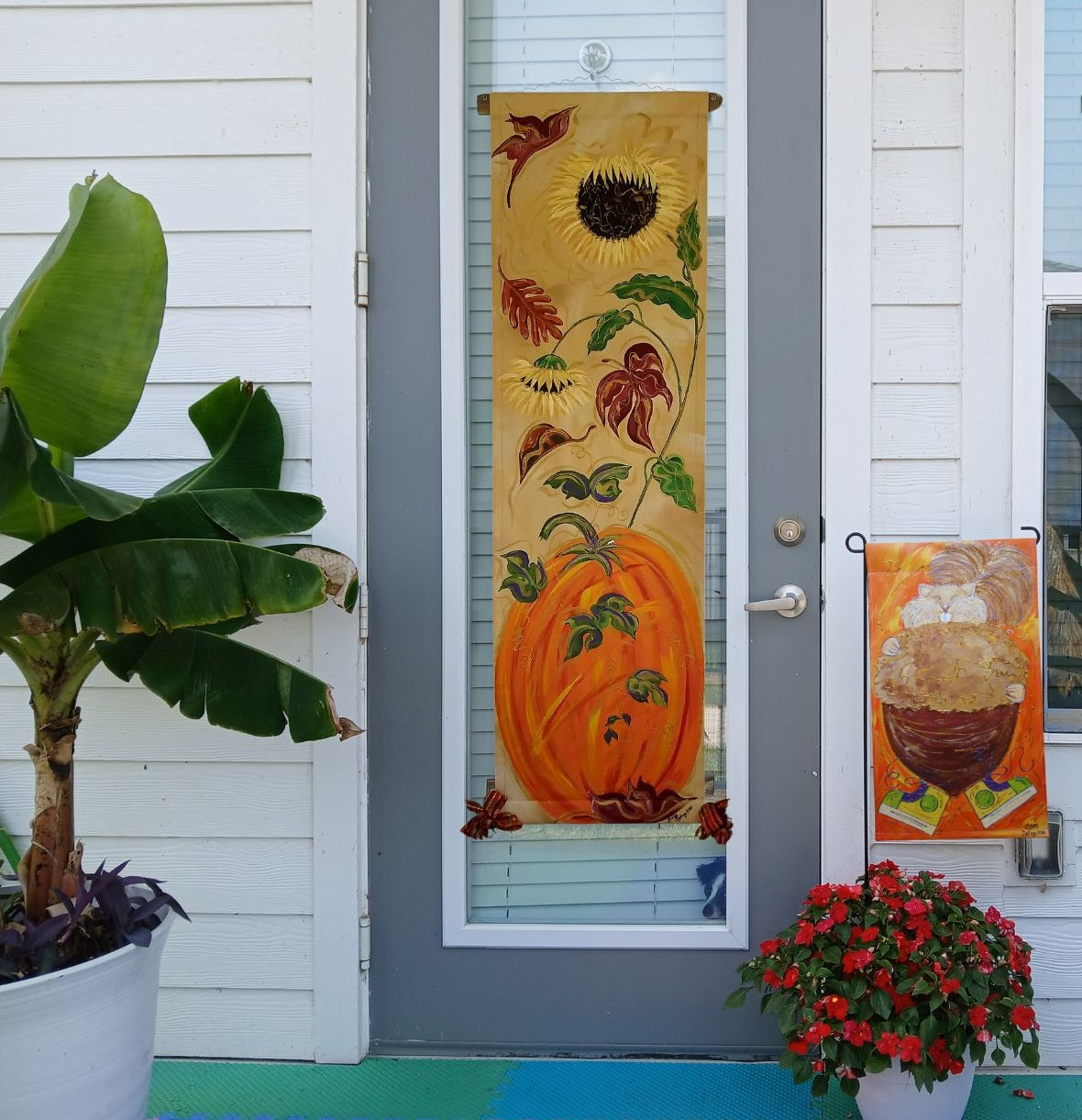 Unique, high quality, all-weather canvas door decoration as an alternative to the traditional wreath.
