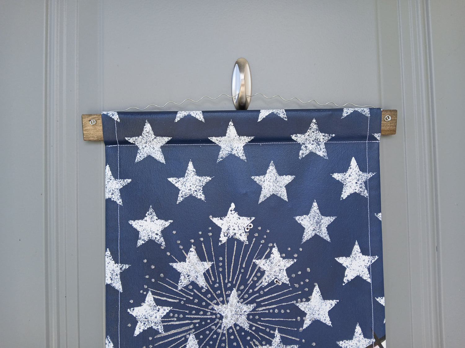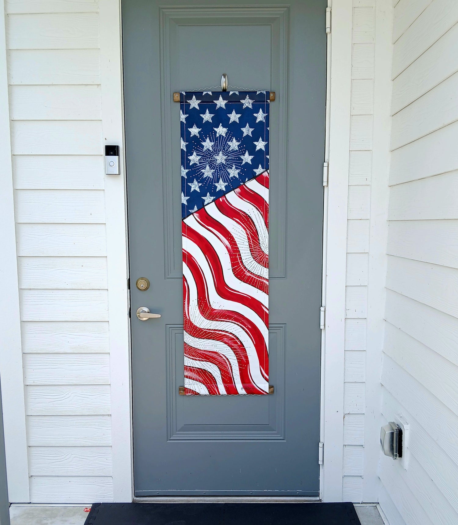 American Flag artwork is the perfect 4th of July, Veteran's Day or Memorial Day greeting to those who enter your home or office! This whimsical door decor measures 16"W X 54" L. It is suitable for hanging on an interior or exterior door or wall. Hand painted with exterior house paints on 100% cotton canvas and embellished with silver glitter puff paint fireworks for that little touch of BLING! Canvas is wrapped at the top and bottom edges around an 18" wood and wire display hanger.