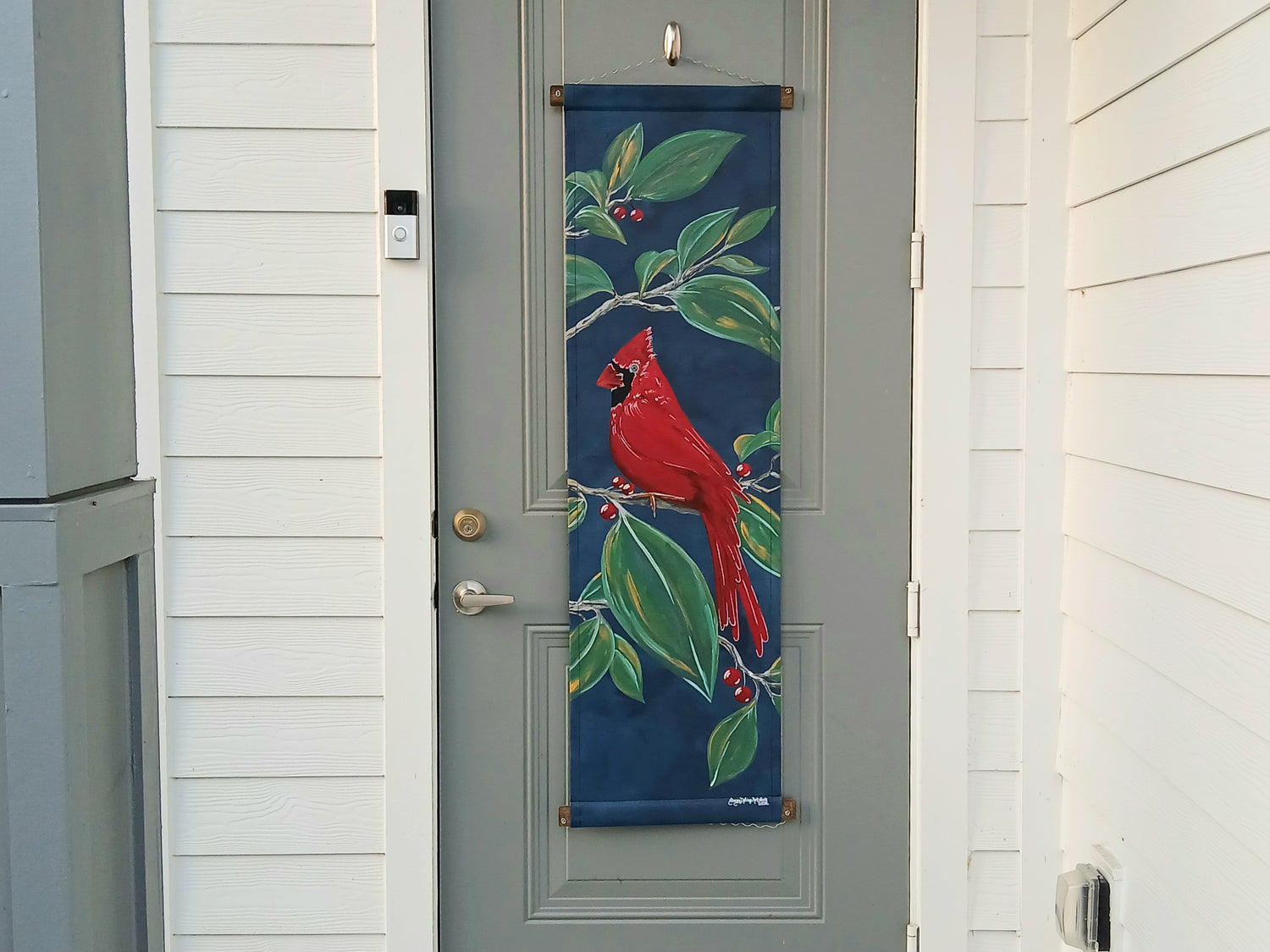 Cardinal is the perfect Winter greeting or Cardinal Fan gift to those who enter your home or office! This whimsical door decor measures 16"W X 44 1/2" L and is suitable for hanging on an interior or exterior door or wall. Door hook not included. Hand painted with exterior acrylic paints on 100% cotton canvas and wrapped at the top and bottom edges around a wood and wire display hanger.