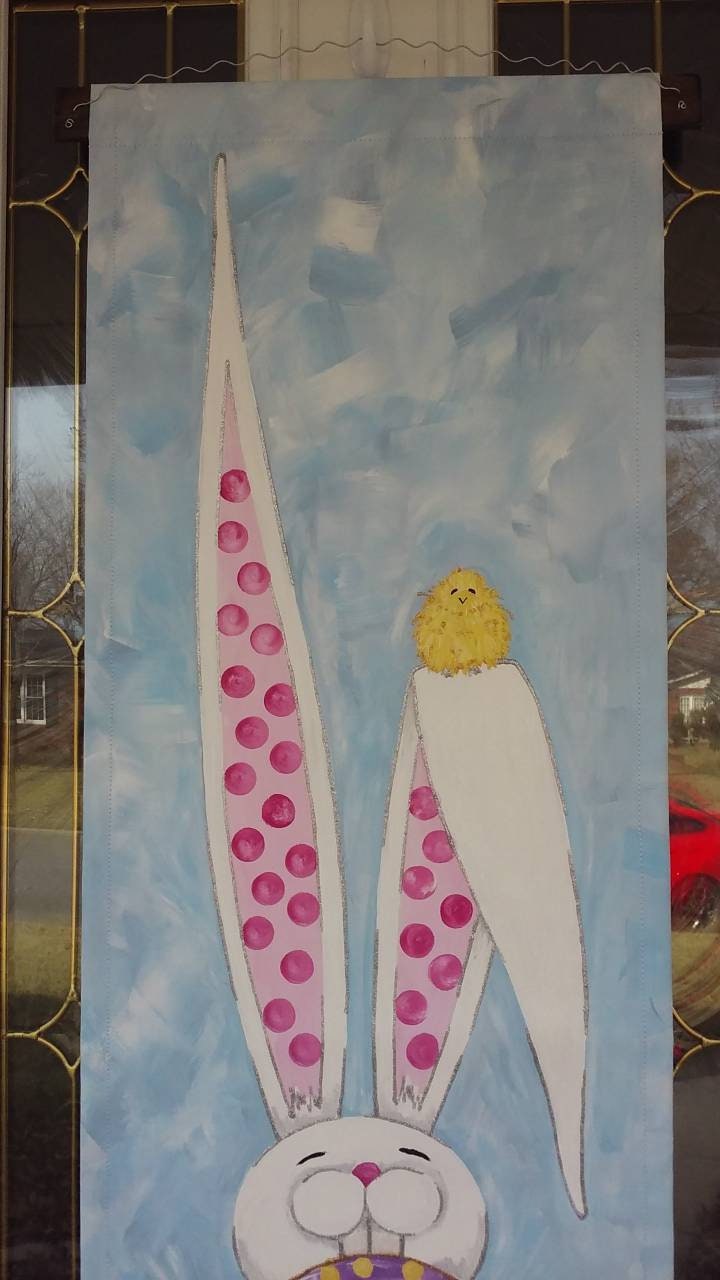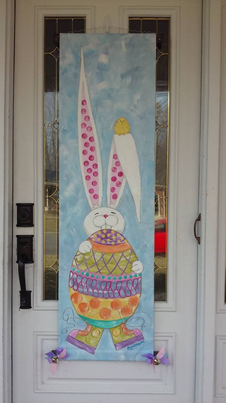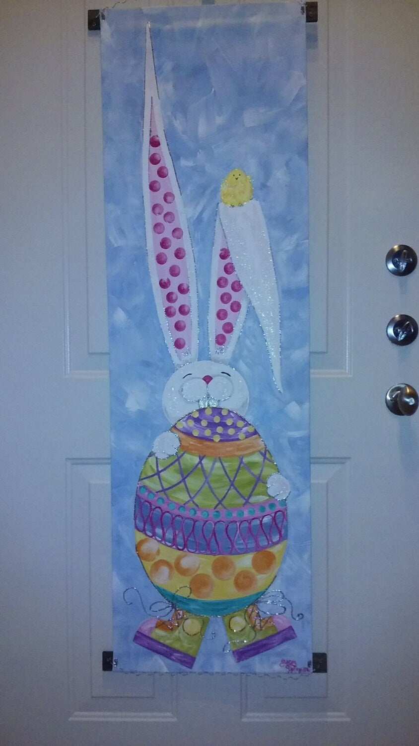 E. Bunny & Peep are the perfect Spring Holiday greeting to those who enter your home or office! This whimsical door decor measures 16"W X 54" L. It is suitable for hanging on an interior or exterior door or wall. Hand painted with acrylic paints on 100% cotton canvas and embellished with glitter puff paint for that little touch of BLING! Canvas is wrapped at the top and bottom edges around a 18" wood and wire display hanger. Each canvas is individually hand painted by me, Stacey Define. There may be subtle differences between the canvas in the photo and the canvas you receive. If you would like a photo of the ACTUAL canvas that I will be shipping to you, just send me a message. DOOR HOOKS with coordinating ribbon (if pictured with the canvas door hanger) are SOLD SEPARATELY.