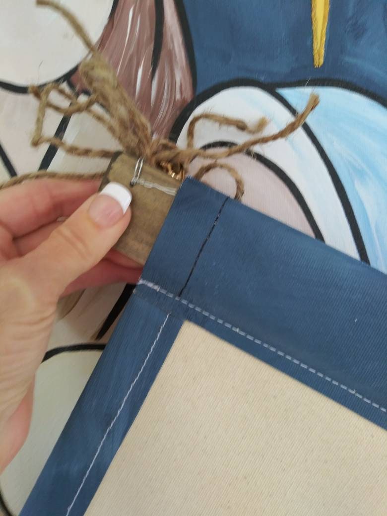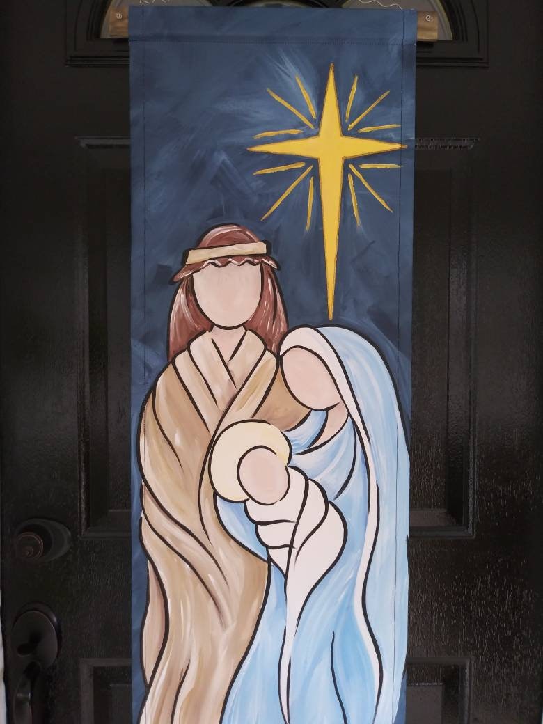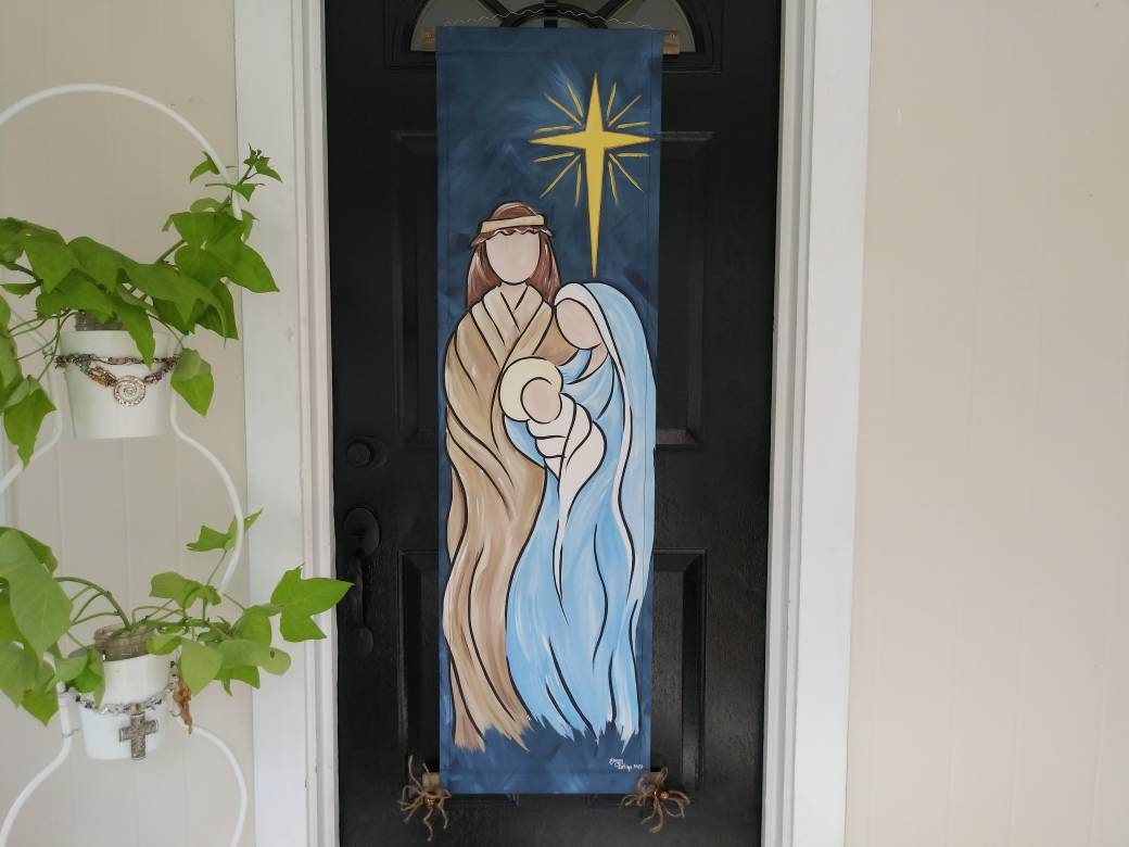 Hand painted Holy Family nativity door decoration on all-weather canvas. A meaningful Christmas wreath alternative for your front door.