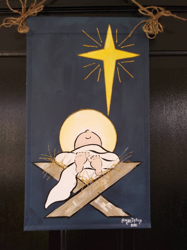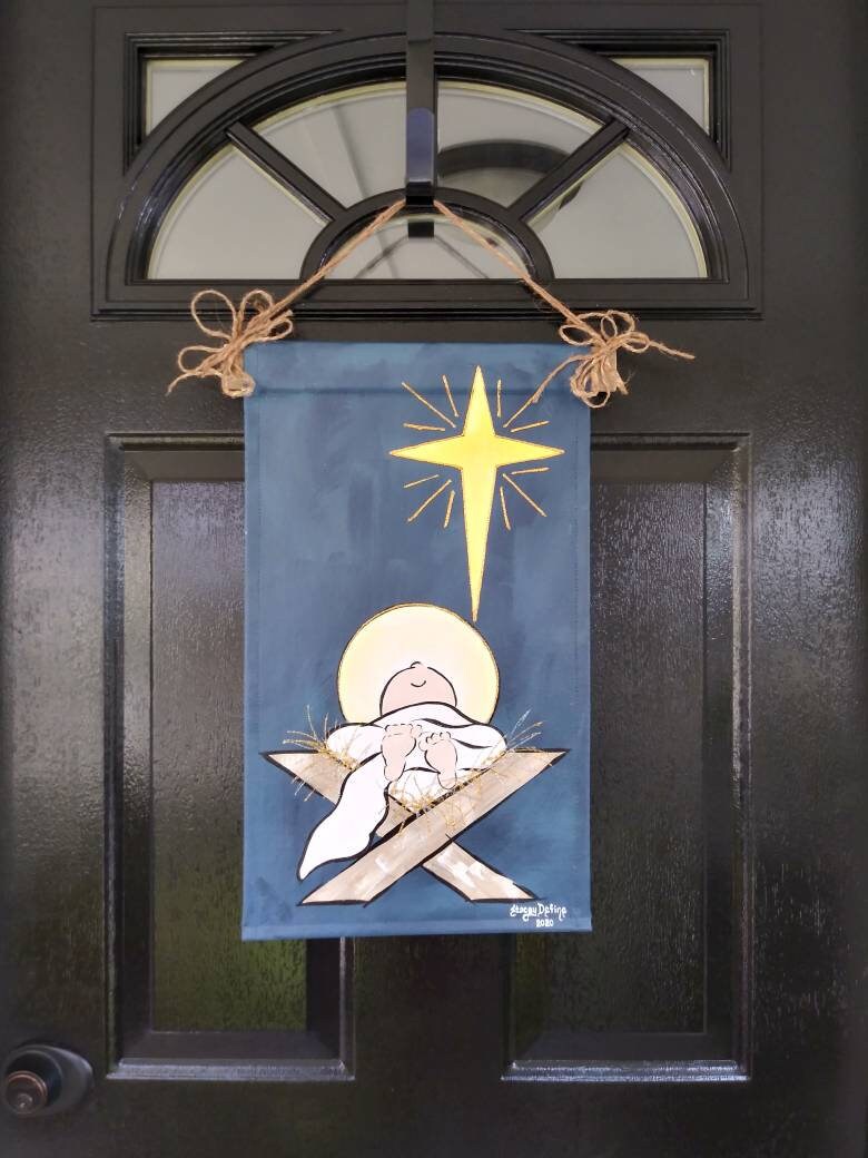 This Baby Jesus in the Manger is the perfect Christmas greeting to those who enter your home or office! This canvas door decor measures 12"W X 21" L and includes the decorative wood and rope hanger. It is suitable for hanging on an interior or exterior door or wall. It may also be used as a garden flag. Hand painted with exterior acrylic paints on 100% cotton canvas and embellished with gold glitter puff paint to add that little touch of shimmer!