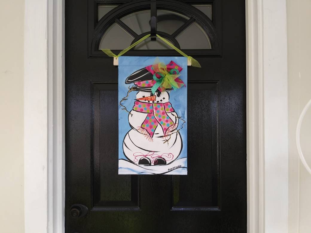 The Winter Snowman with Pink Scarf is the perfect Winter / Spring greeting to those who enter your home or office! This canvas door decor measures 12"W X 21" L and includes the decorative hanger. It is suitable for hanging on an interior or exterior door or wall. It may also be used as a garden flag. Hand painted with exterior house paints on 100% cotton canvas and embellished with gold glitter puff paint to add that little touch of shimmer! How do YOU define art?