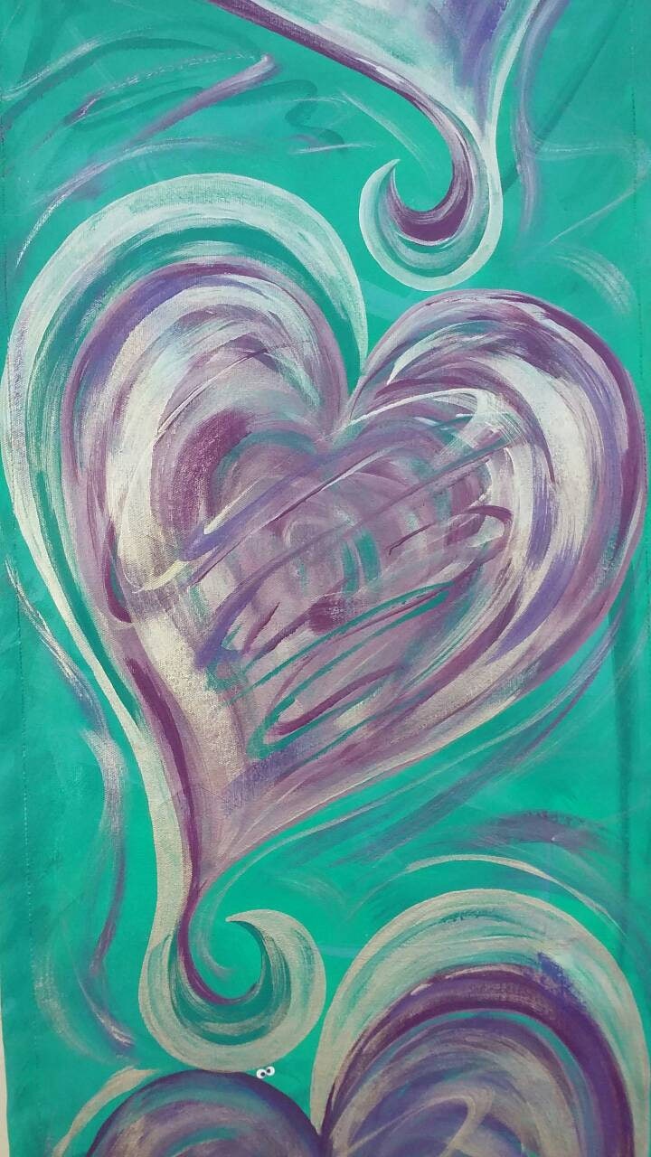 Three Hearts all-weather door hanger is perfect for indoor or outdoor display. Banner measures 16”W x 54”L and is hand painted with exterior house paints on 100% cotton canvas. Artwork has a decorative wooden canvas hanger for display.