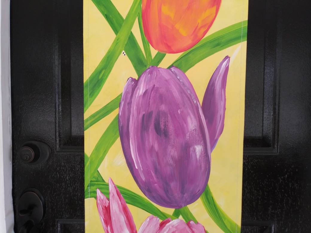 Hand painted with exterior acrylic paints on 100% cotton canvas. Canvas measures 16"W x 54"L and is wrapped at the top and bottom edges around an 18" wood and wire display hanger. Each canvas is individually hand painted by me, Stacey Define. There may be subtle differences between the canvas in the photo and the canvas you receive. If you would like a photo of the ACTUAL canvas that I will be shipping to you, just send me a message. Door hooks with coordinating ribbon (if pictured with the canvas door hanger) are sold separately.
